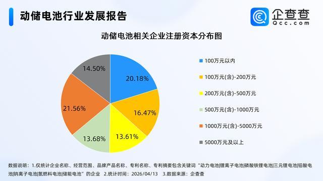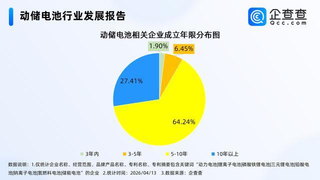 企查查数据显示,截至4月13日,国内现存动储电池相关企业1.39万家。从成立年限分布来看,动储电池相关企业多为成熟企业,成立5-10年的企业占比最高,达64.24%。从注册资本方面来看,动储电池相关企业的注册资本分布层级较为均匀,注册资本在1000万元(含)-5000万元的企业最多,占比21.56%。从地区分布来看,动储电池相关企业具备较高的地域集中性,分布在华南地区的相关企业最多,占比达34.09%。