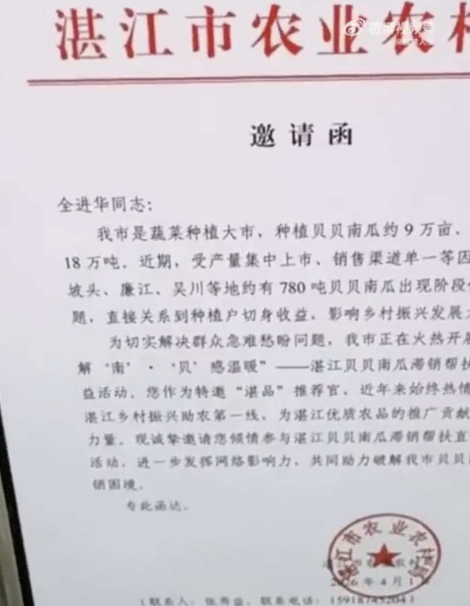 全进华晒出的是湛江政府机构给全进华发出的邀请函。文件中指出,湛江多户农民的贝贝南瓜出现滞销,政府特邀请全进华帮助农民卖南瓜,并充分认可他这些年的助农付出和成效。